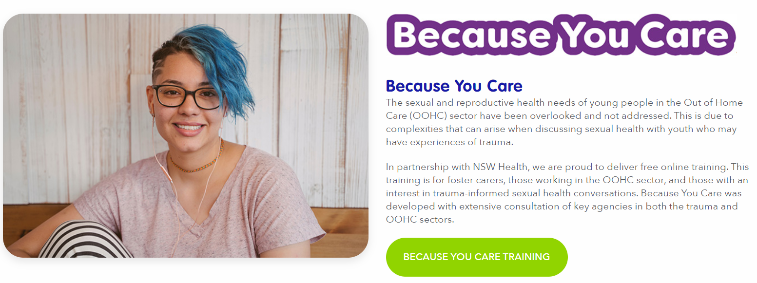 The Program has developed resources targeted to workers and carers who have significant contact with young people with experience of the OOHC System. Resources developed include a fact sheet and guide to trauma informed sexual health promotion, a fact sheet on sexual health promotion for people with a disability and an online training titled Because You Care that aims to develop the capacity of foster carers to engage young people around positive sexual health messaging.