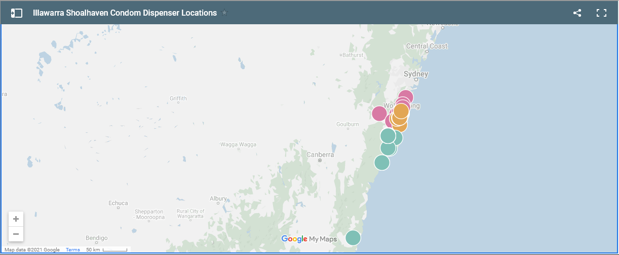 A website has allowed us to do more nifty things like have a Google Map showing the locations of the 78 services in the Illawarra Shoalhaven who have free condoms for their clients as part of our Condom Dispenser Project.
