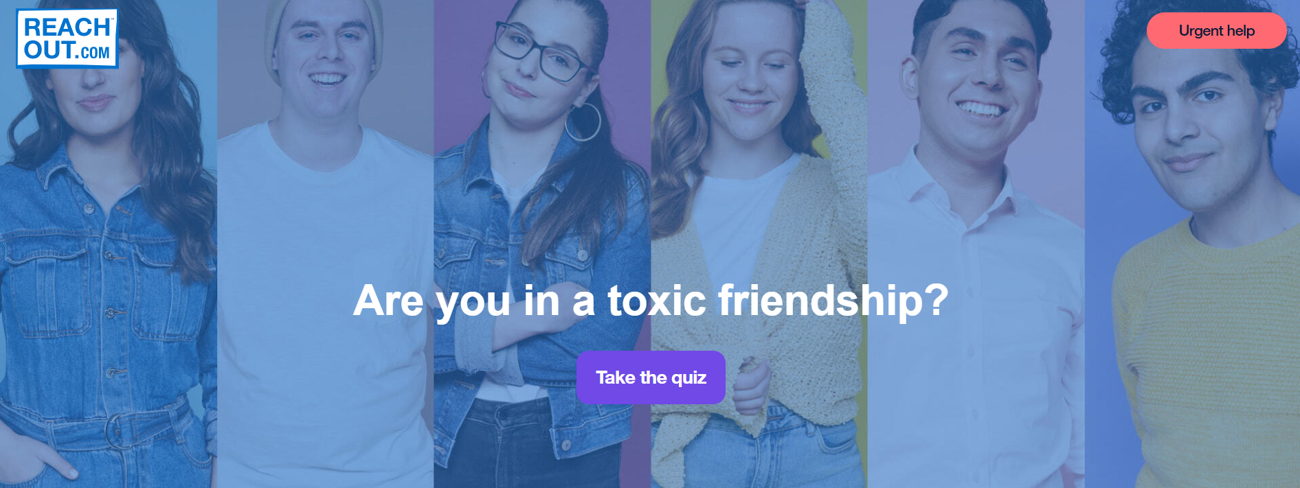 Are you in a toxic friendship? All friendships have their ups and downs, but they should never leave you feeling bad about yourself. Take the quiz and find out. At the end of the quiz Reachout will give you tips on how to maintain positive friendships or deal with unhealthy or toxic friendships. ReachOut is the most accessed online mental health service for young people and their parents in Australia.